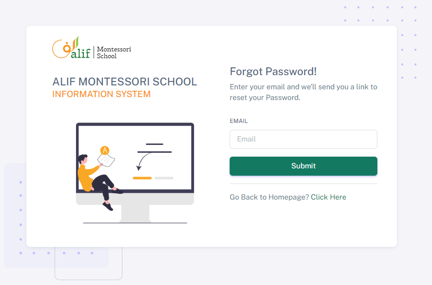 Berikut merupakan tampilan login pada AMSIS, terdapat input username/email dan password. Pada amsis end user tidak bisa mendaftarkan dirinya secara langsung, proses bisnis yang berlaku disini adalah setiap Student yang sudah dinyatakan begabung dengan keluarga besar Alif Montessori School akan diberikan hak akses untuk dapat masuk ke sistem.